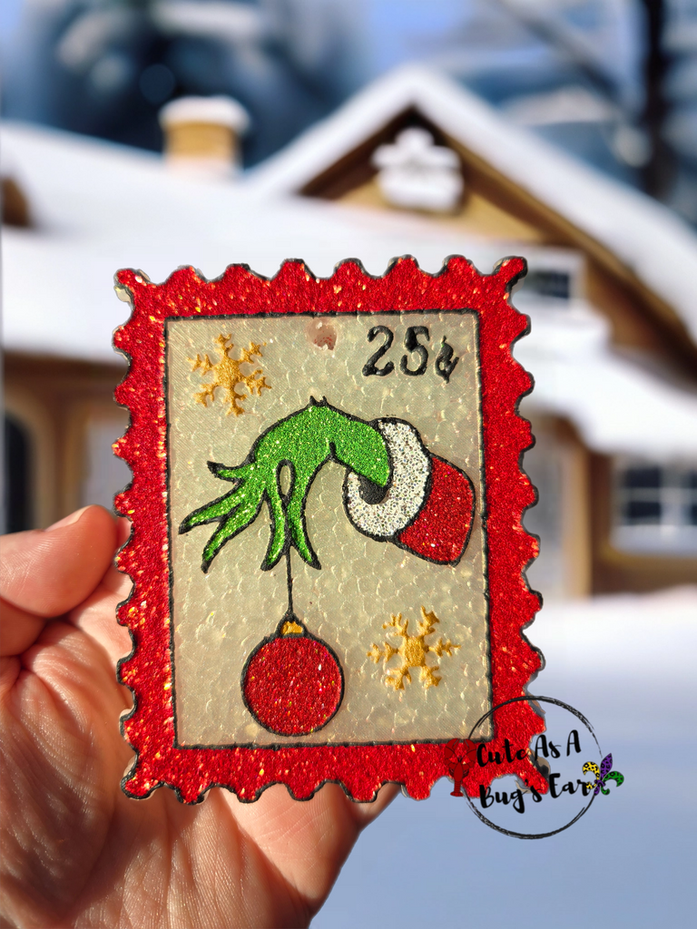 Christmas Green Guy Postage Stamp freshie. Can do in any colors upon request. Picture shown with glitter.